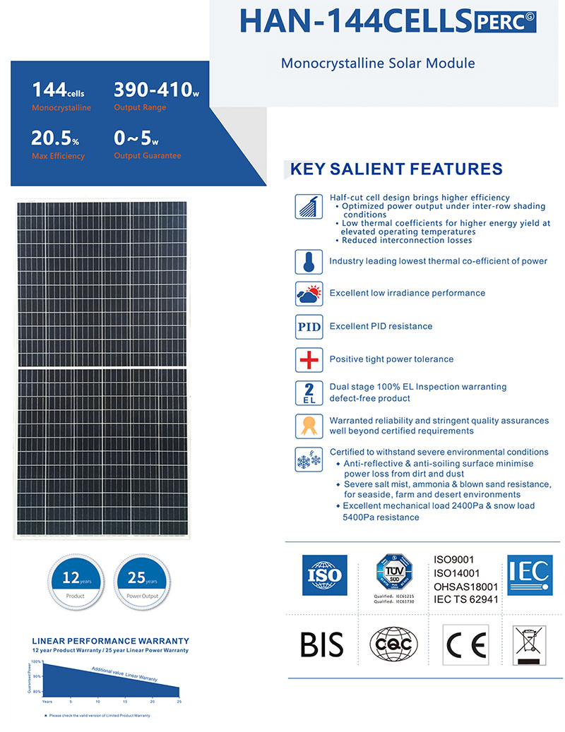 The half cell PV modules, are rational designed, excellent in workmanship, and have a stable performance,power range covers 390W-410W, are widely used in photovoltaic power stations.The products have the advantages of high efficiency, high power, high reliability and long life.