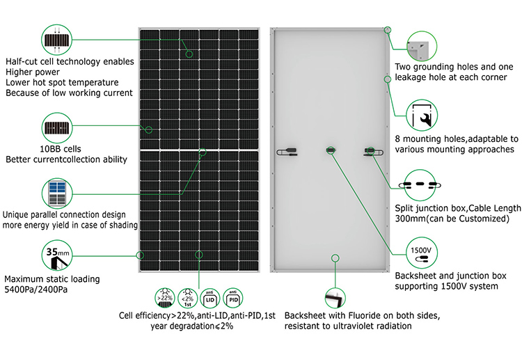 Big Size PV modules, are rational designed, excellent in workmanship, and have a stable performance MBB solar panels,power range covers 600W, are widely used in photovoltaic power stations.