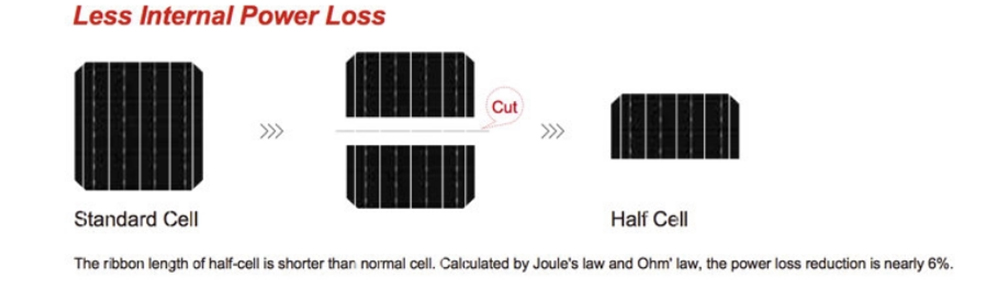 Since the voltage of the solar crystalline silicon cell is independent of the area, while the power is proportional to the area, the voltage of half a cell remains unchanged compared with the whole cell, while the power and current are halved.