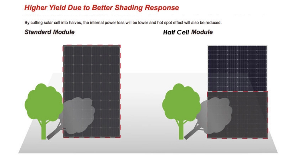 Due to the reduction of internal circuit and internal consumption, packaging efficiency is improved;In addition, the working temperature of the component is reduced, which reduces the probability of hot spot and improves the reliability and safety of the component.In the aspect of shadow shading, due to the unique design, it has better anti-shading performance than conventional components.Compared with traditional components, half-chip components are mainly manifested in three aspects: